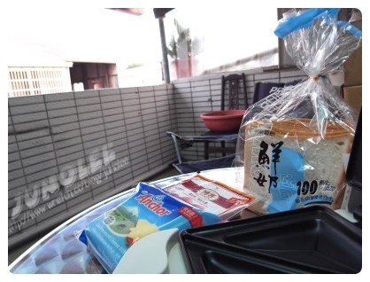 買了鮮奶吐司、火腿、起司片,吐司面抹上奶油,火腿片也用三明治機稍為煎過,放上起司,二片吐司一夾就好了!