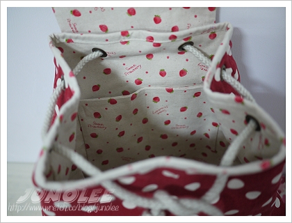 裡布是可愛的草莓棉麻布,釘上雞眼釦,綁上麻布繩,